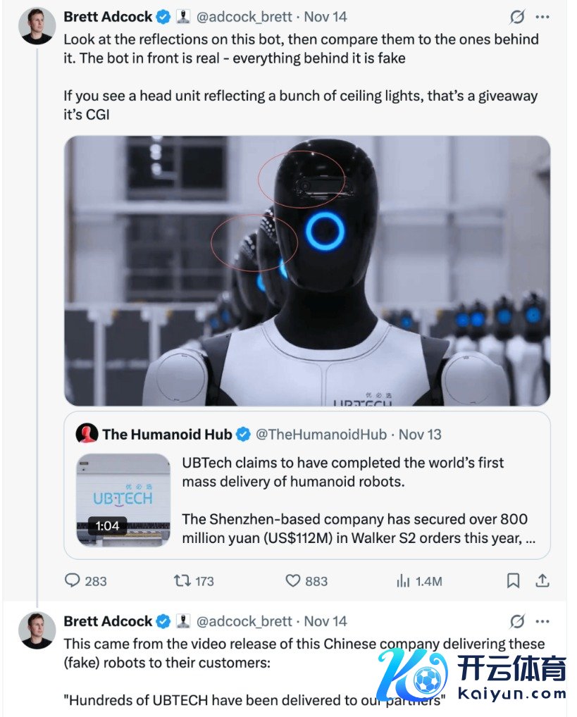 此前,优必选发布了工业东说念主形机器东说念主Walker S2量产委用视频。Figure独创东说念主布雷特·爱德考克(Brett Adcock)在酬酢平台公开质疑视频中是“fake robots”,大致率是电脑殊效制作。