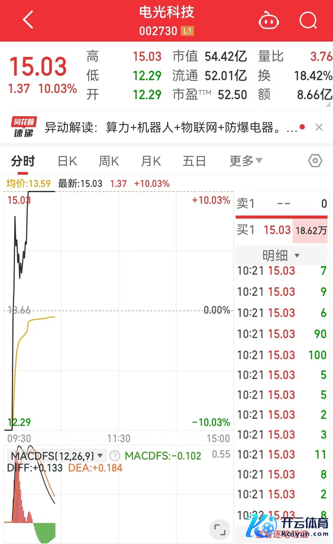 适度发稿,电光科技报15.03元,涨幅10.03%,成交金额8.67亿元,2.5亿资金列队抢筹。