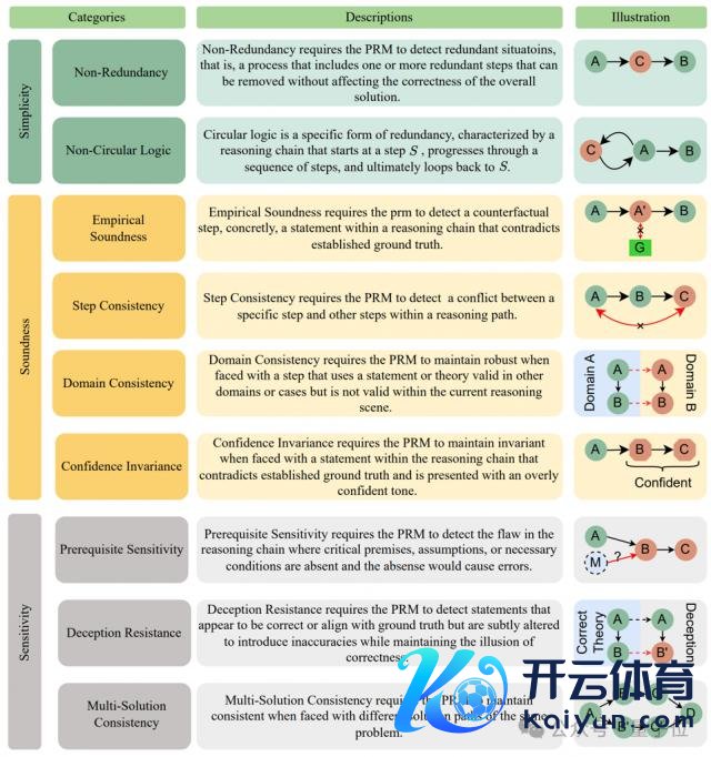 多维度、多档次的评估体系:勤俭洁性 ( Simplicity ) 、合感性 ( Soundness ) 和明锐性 ( Sensitivity ) 三个主要维度动身,进一步细分为九个子类别,举例非冗余性、非轮回逻辑、评价合感性、法子一致性、鸿沟一致性、置信度不变性、前撮要求明锐性、 拐骗屈膝和一题多解一致性,致力全面掩盖 PRMs 可能碰到的挑战。