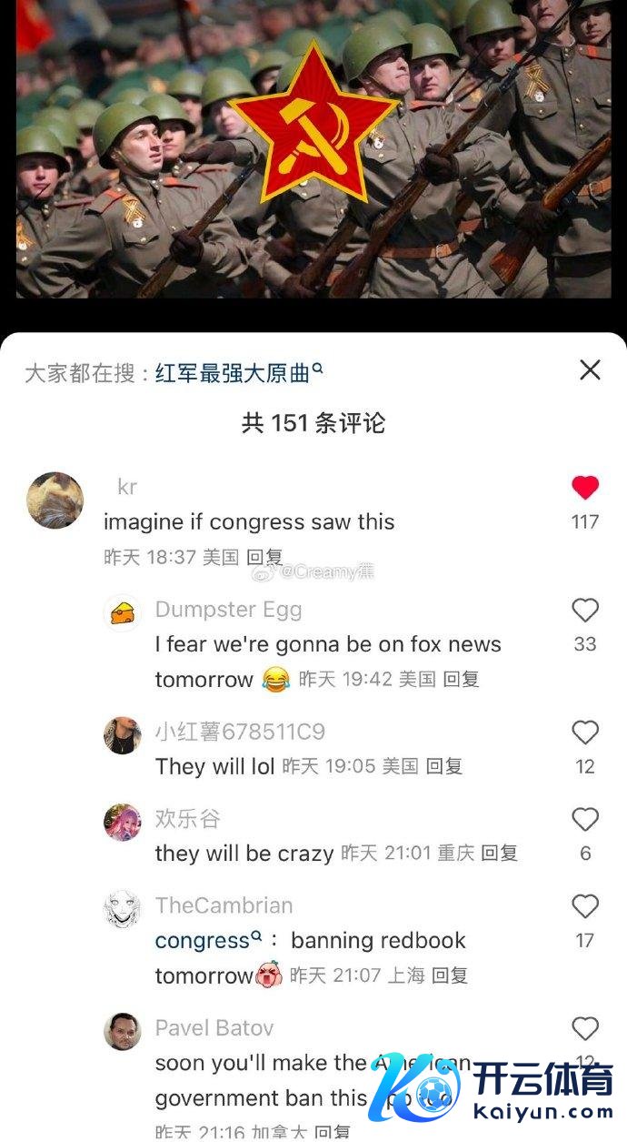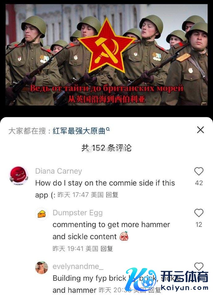 再比如说,有东说念主在小地瓜上刷到了苏联红歌《赤军最庞杂》,还有“亲爱的达瓦里希,海外共产目的畅通万岁”这样的本色,通盘东说念主已而就被诱惑了。有的东说念主在喊“共产目的快来解放好意思国吧”,有的东说念主在簸弄好意思国政府,“我皆不敢想如果我们国会知说念我在看这个他们会有多抓狂”。还有的东说念主感触说,“正本红色空想这颗星星之火还在我们心中放置呢”。