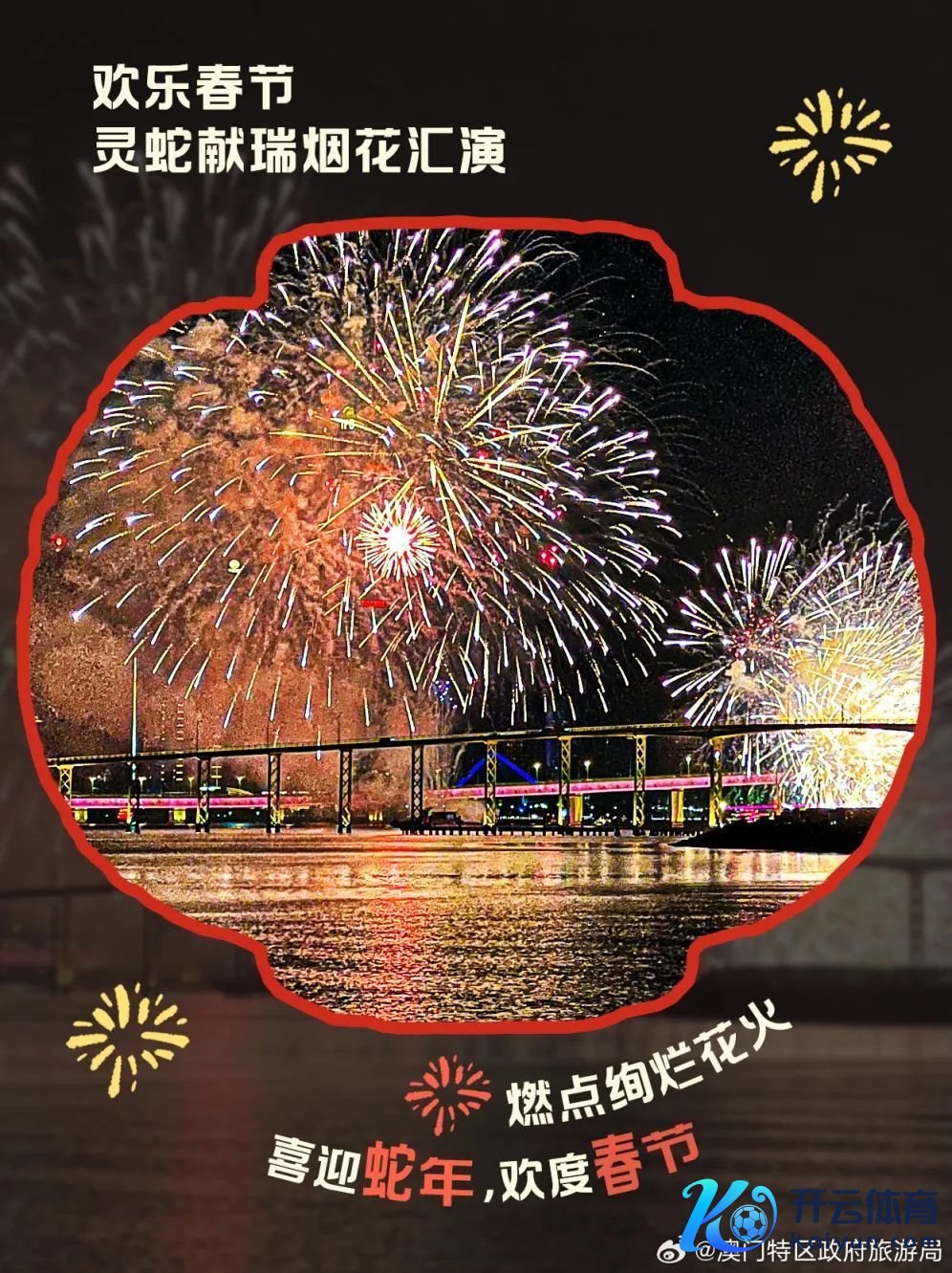 据澳门特区政府旅游局音尘,春节技能,澳门将举办“惬心春节 灵蛇献瑞”烟花汇演,差异在1月31日、2月4日及12日晚各献艺一场大型烟花秀。