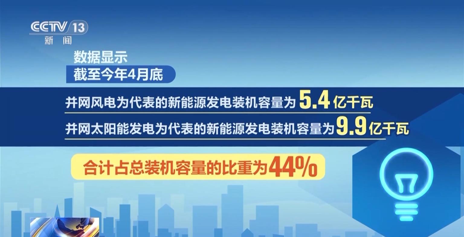 数据自满,甘休本年4月底,非化石动力发电装机容量占总装机容量比重接近六成;其中以并网风电、太阳能发电为代表的新动力发电装机容量永别为5.4亿千瓦、9.9亿千瓦,共计占总装机容量的比重为44%。