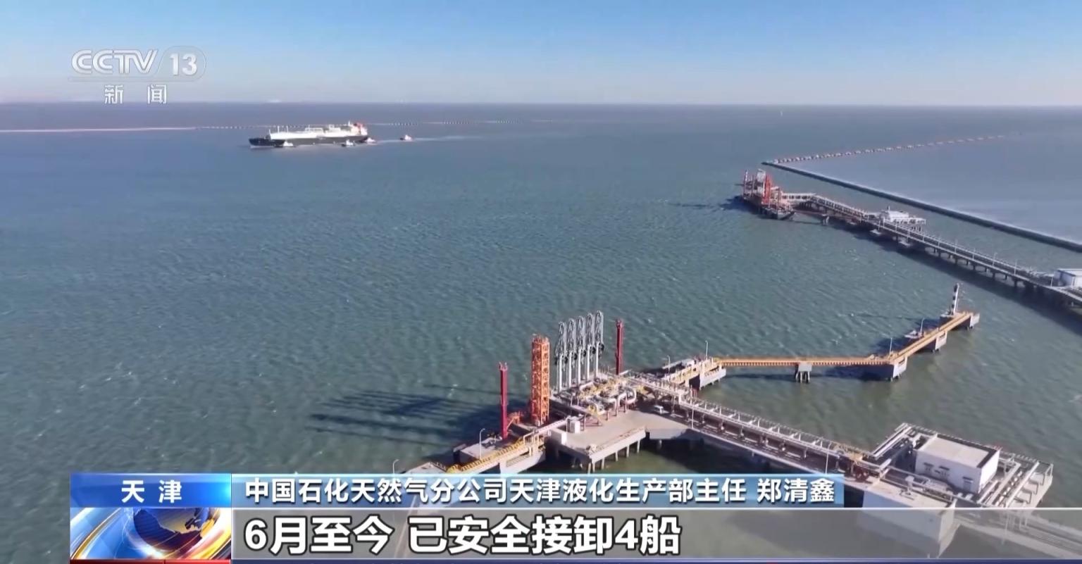 在天津,一艘满载9万吨液化自然气的输送船靠泊液化自然气领受站船埠,这是这个站近3天接卸的第2船液化自然气,本年已累计接卸液化自然气超130万吨,为华北地区迎峰度夏蓄能保供。
