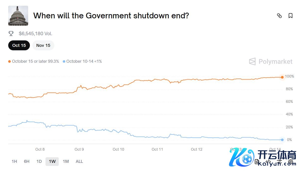 华尔街见闻稽察,本周一,预测平台Polymarket的数据清楚,政府关门适度于10月15日或之后的概率已很是99%,最迟10月14日齐备关门的概率不及1%。